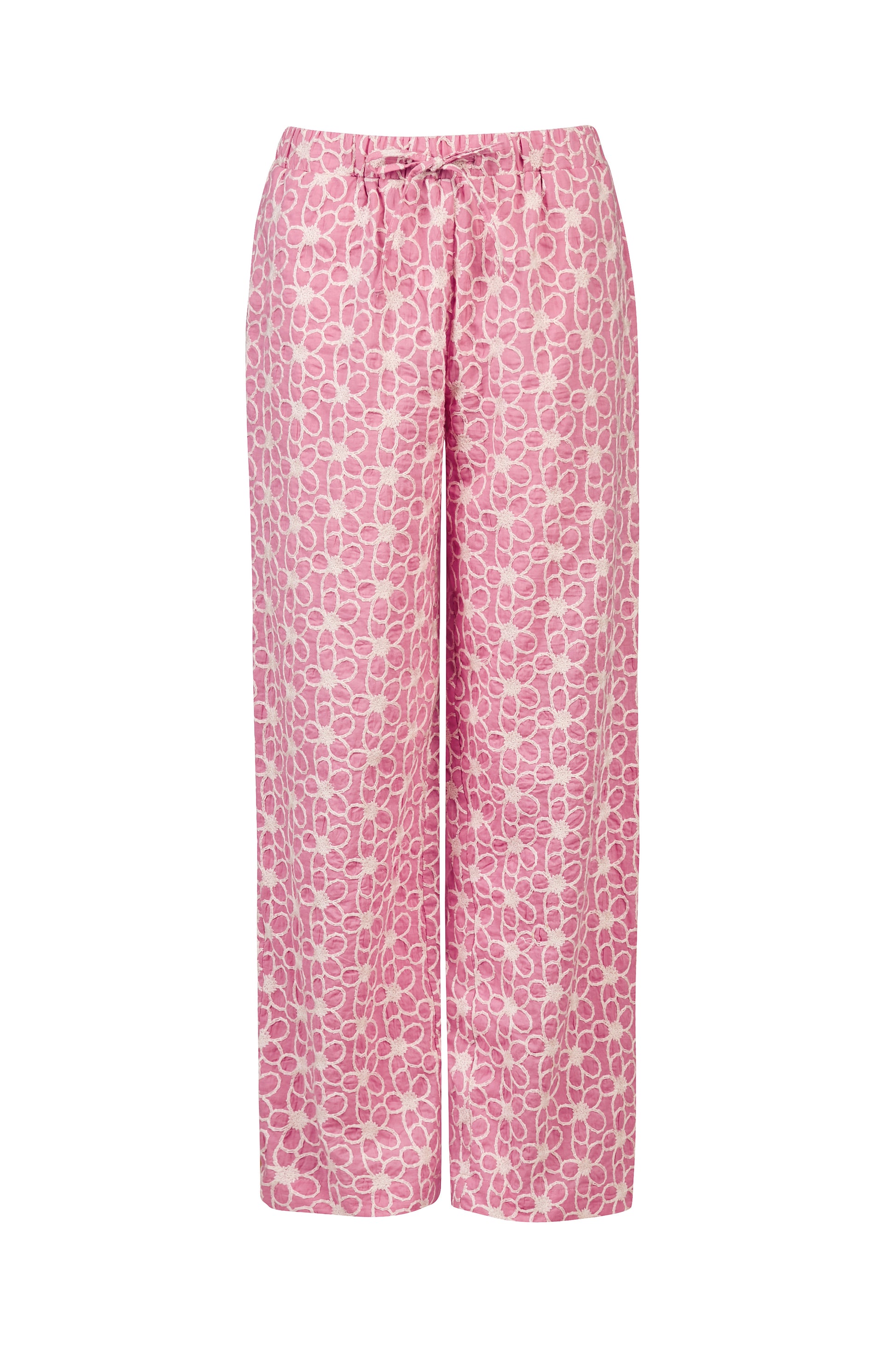 Dwuczęściowy zestaw z czystej, oddychającej bawełny, który łączy komfort piżamy z wyglądem stylowego kompletu. Lekki, przewiewny materiał w haftowane kwiaty i luźny krój sprawiają, że świetnie sprawdza się zarówno w domu, jak i na zewnątrz. Góra wiązana na troczek, z praktycznymi kieszeniami i rękawami wykończonymi elastycznym ściągaczem, który tworzy subtelną falbankę. Spodnie z prostą nogawką zapewniają wygodę przez cały dzień. Również w pasie wiązane na troszek. Idealny wybór na spokojne poranki, weekendowe wyjazdy czy niezobowiązujące spotkania.